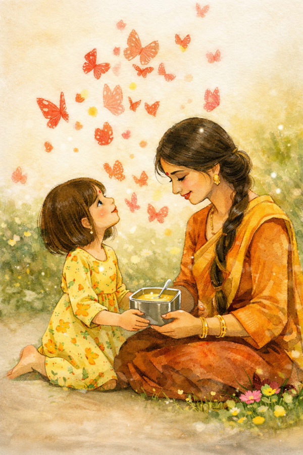 One evening in the kitchen, I picked up a spoonful of ghee and slowly tasted it, savoring every bit. My daughter noticed and asked why I was eating plain ghee. I told her that whenever I taste the ghee my mother sends, it feels as though I’m back at her home. She laughed and said, “You always say that — just so you can keep the tasty ghee for yourself!”